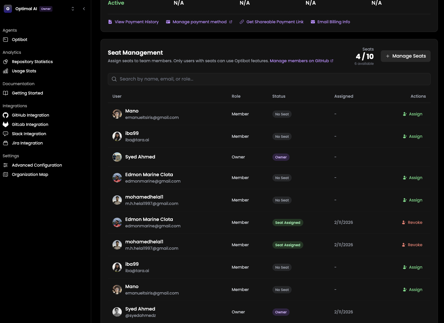 You can now easily give access to Optibot to new users using our seat management dashboard. Simply head over to the dashboard on agents.getoptimal.ai then click on your organization name > organization settings and assign seats to the users who you want reviews and summaries available for.
